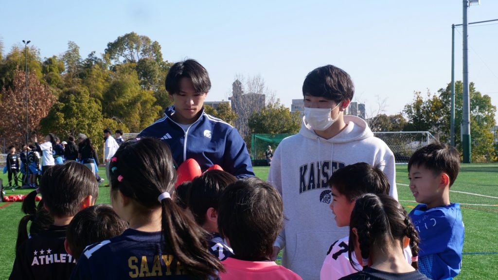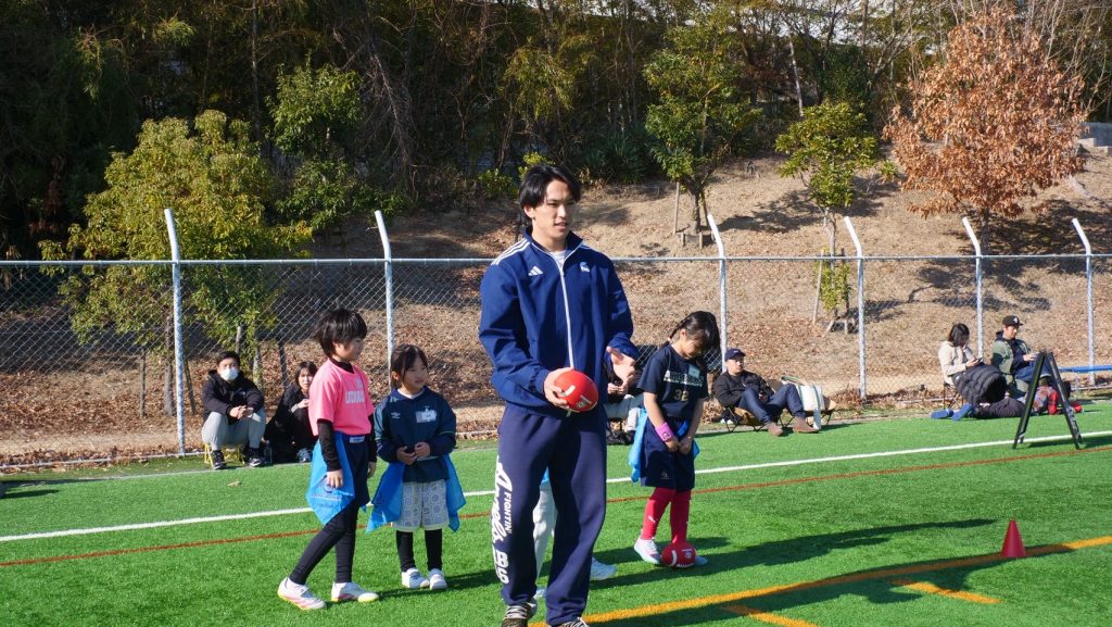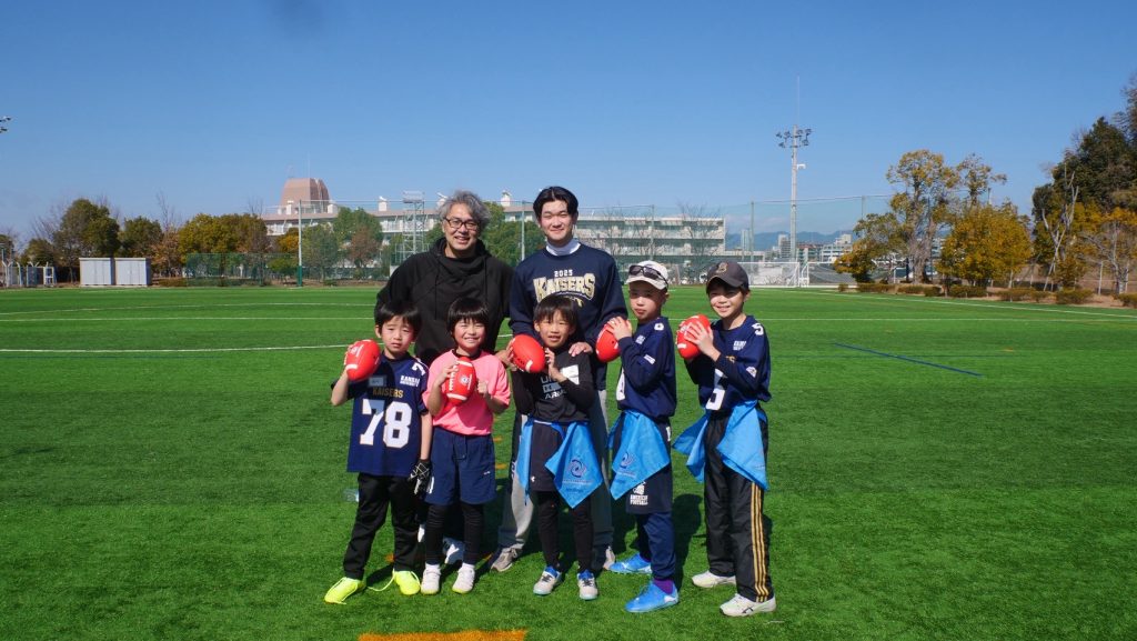練習後は大学KAISERSのQB土居選手が、投げ方のレッスンをしてくれました!